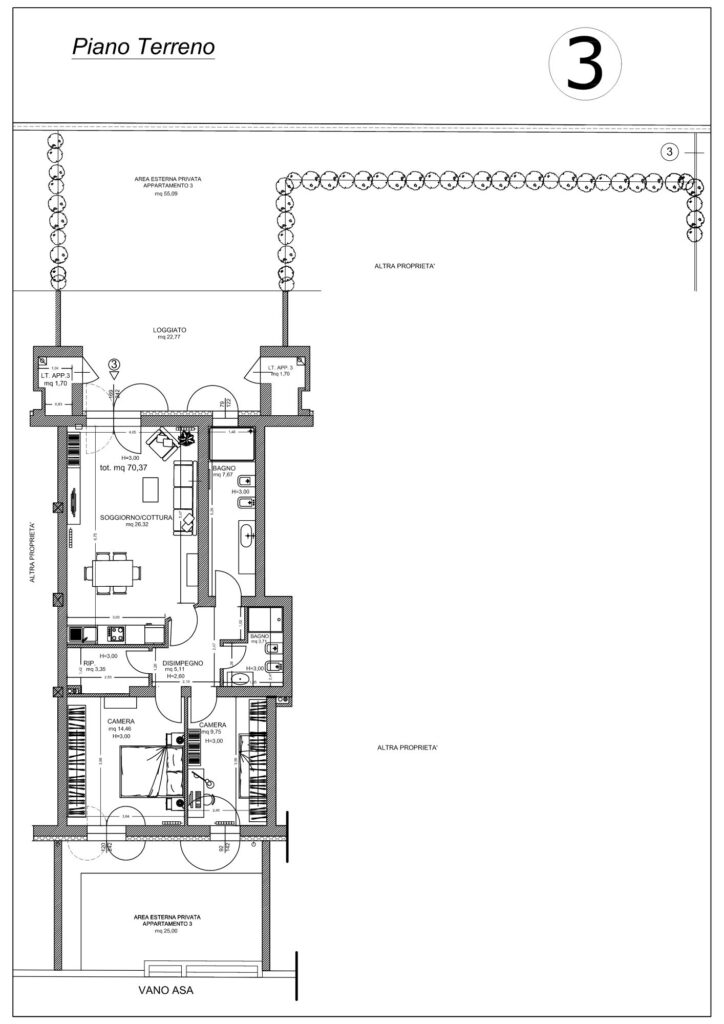 L’appartamento si sviluppa al piano terra su una superficie commerciale di mq 70,00 e calpestabile di mq 58,00 con mq 30,00 circa di area esterna privata.