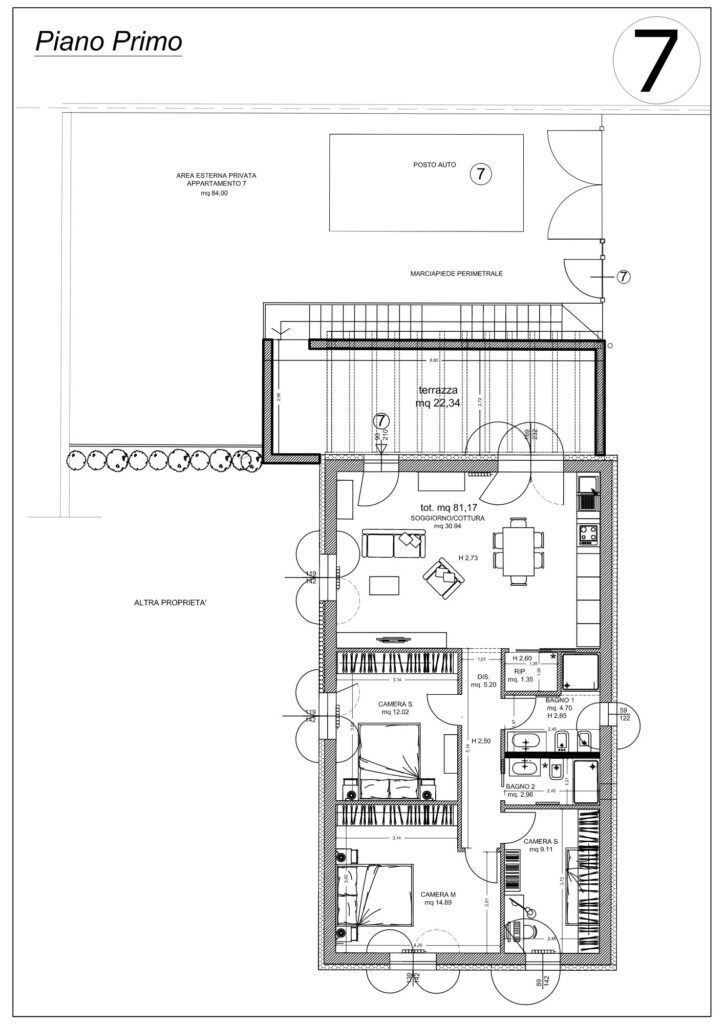 L’appartamento ha accesso indipendente da scala privata e si sviluppa al piano primo su una superficie commerciale di mq 96,00 e calpestabile di mq 81,00 con mq 74,00 di area esterna privata.