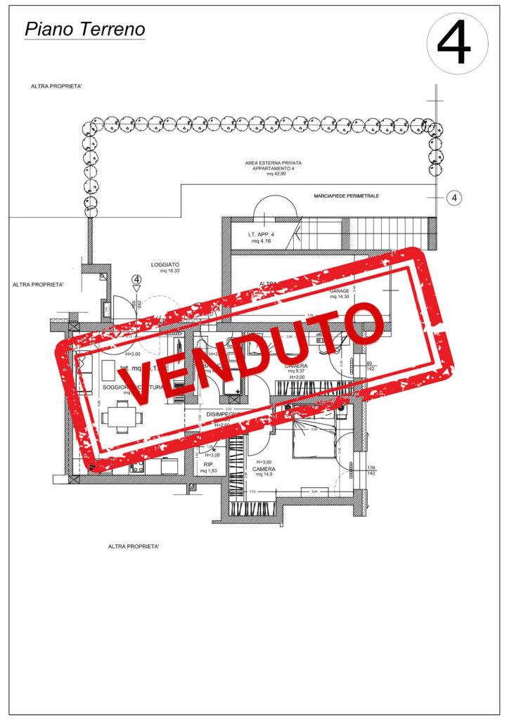 Completa la proprietà un garage di mq 15,00, un locale tecnico e un posto auto privato.