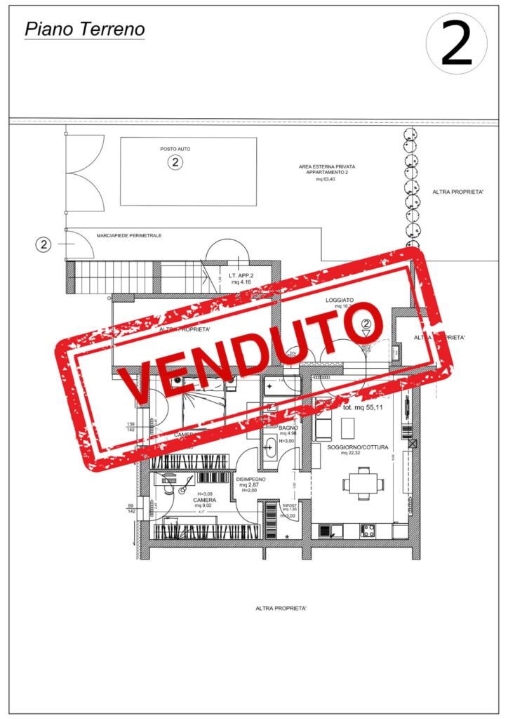 L’appartamento si sviluppa al piano terra su una superficie commerciale di mq 67,00 e calpestabile di mq 55,00 con mq 50,00 circa di area esterna privata.