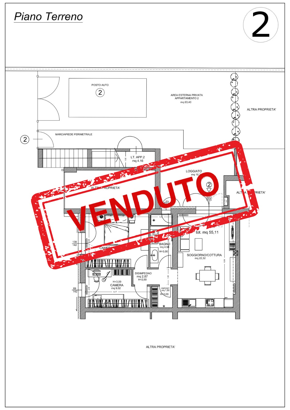 L’appartamento si sviluppa al piano terra su una superficie commerciale di mq 66,00 e calpestabile di mq 55,00 con mq 27,00 circa di area esterna privata.