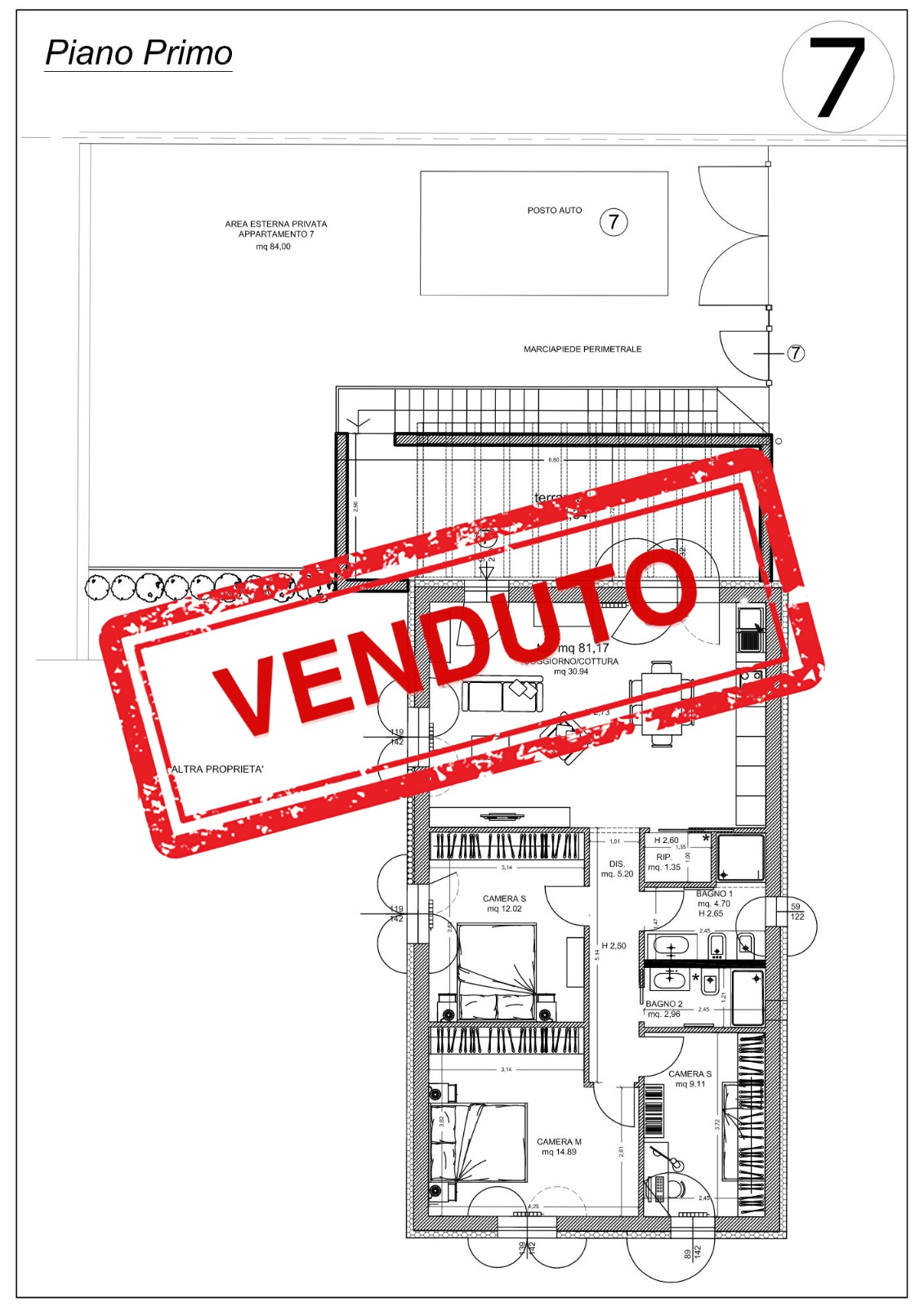 L’appartamento ha accesso indipendente da scala privata e si sviluppa al piano primo su una superficie commerciale di mq 96,00 e calpestabile di mq 81,00 con mq 74,00 di area esterna privata.