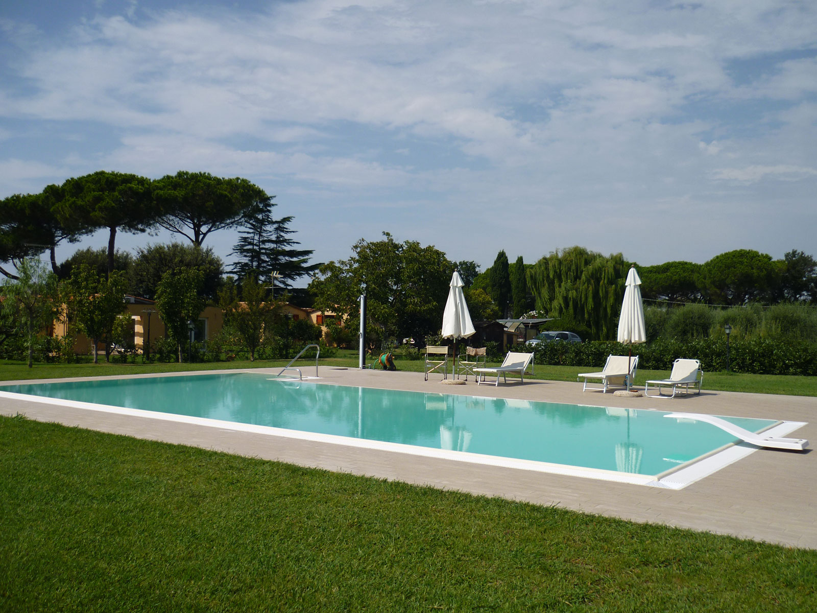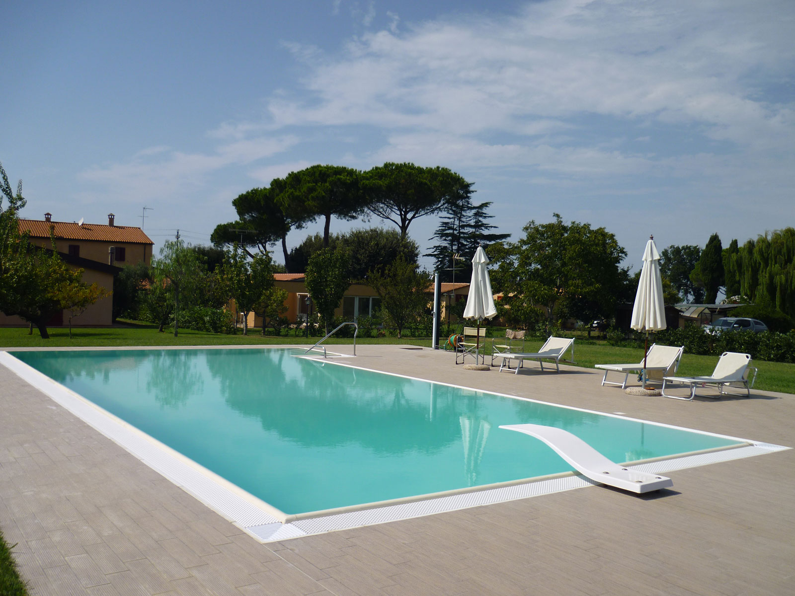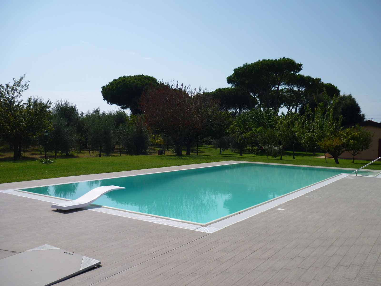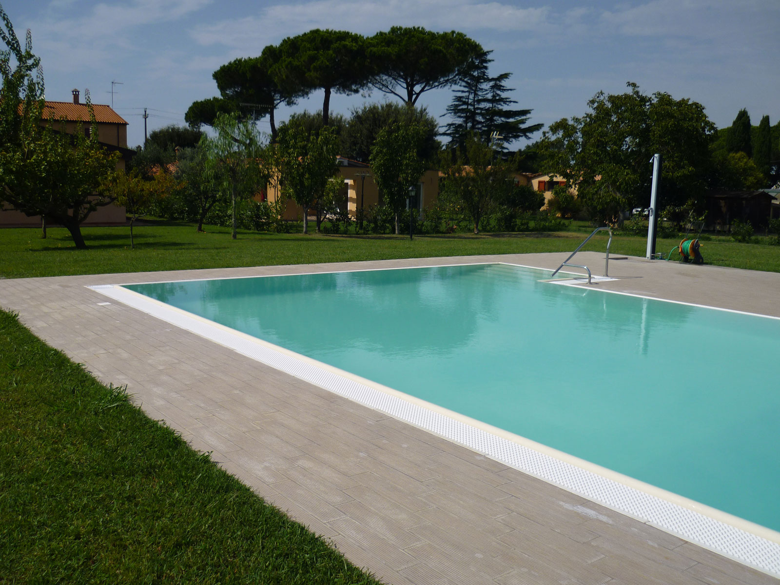 Ci siamo occupati della fornitura e posa in opera di tutta la pavimentazione circostante la piscina e degli accessori ad essa corredati come doccia esterna, trampolino, pulitore automatico e copertura invernale.