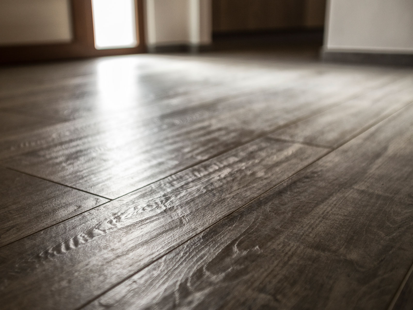 Pavimenti effetto legno, in stile nordico, rivestimenti minimali per il bagno padronale e colorati per il bagno della figlia, soggiorno e cucina di tendenza.