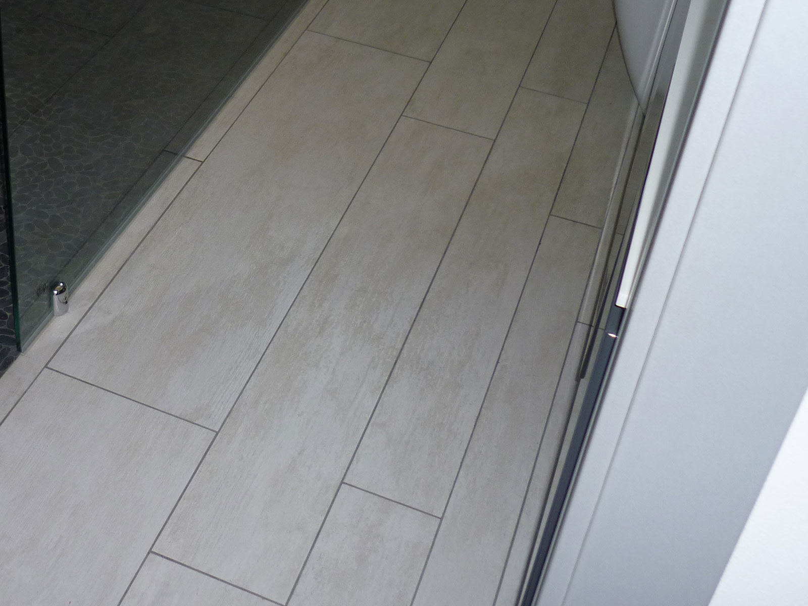 Pavimento effetto legno ed un bagno con piatto doccia in sassi e rivestimento effetto pietra per ricreare una piccola oasi di relax e benessere.
